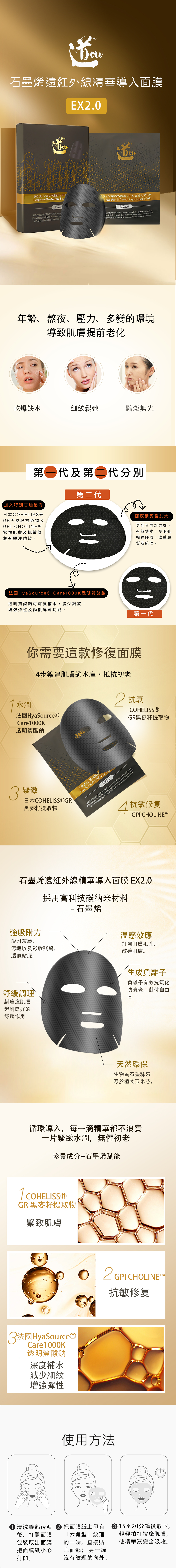 第二代「石墨烯面膜EX2.0」,面膜紙剪裁加大,更配合面部輪廓,有效鎖水,令毛孔暢通呼吸,改善膚質及紋理。加入特別日本COHELISS® GR 黑麥籽提取物及 GPI CHOLINE™ 特别甘油配方,緊致肌膚及抗敏修复有顯注功效。 法國HyaSource® Care1000K 透明質酸鈉可深度補水,減少細紋,增強彈性及修復屏障功能。