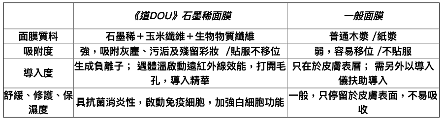 使用「石墨稀」為面膜紙,由於遇體溫後發揮遠紅外線效能,有效促進面部血液循環及身陳代謝,打開毛孔之餘並帶走面上未能完全清除的多餘彩妝及污洉。含抗菌消炎原素排除毒素; 其遠紅外線功能,能導入面膜《道DOU》特別配方之精華,無需額外配合外置的導入儀器,簡單方便,便能享有「擴張去污、深層導入」的效果。令皮膚真正去除污洉角質,深層導入補水滋潤,