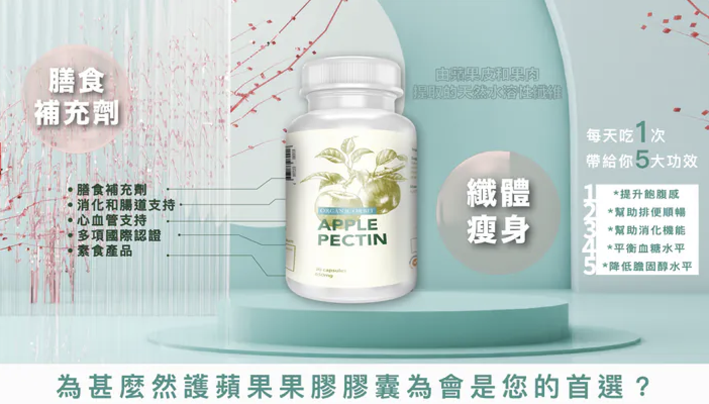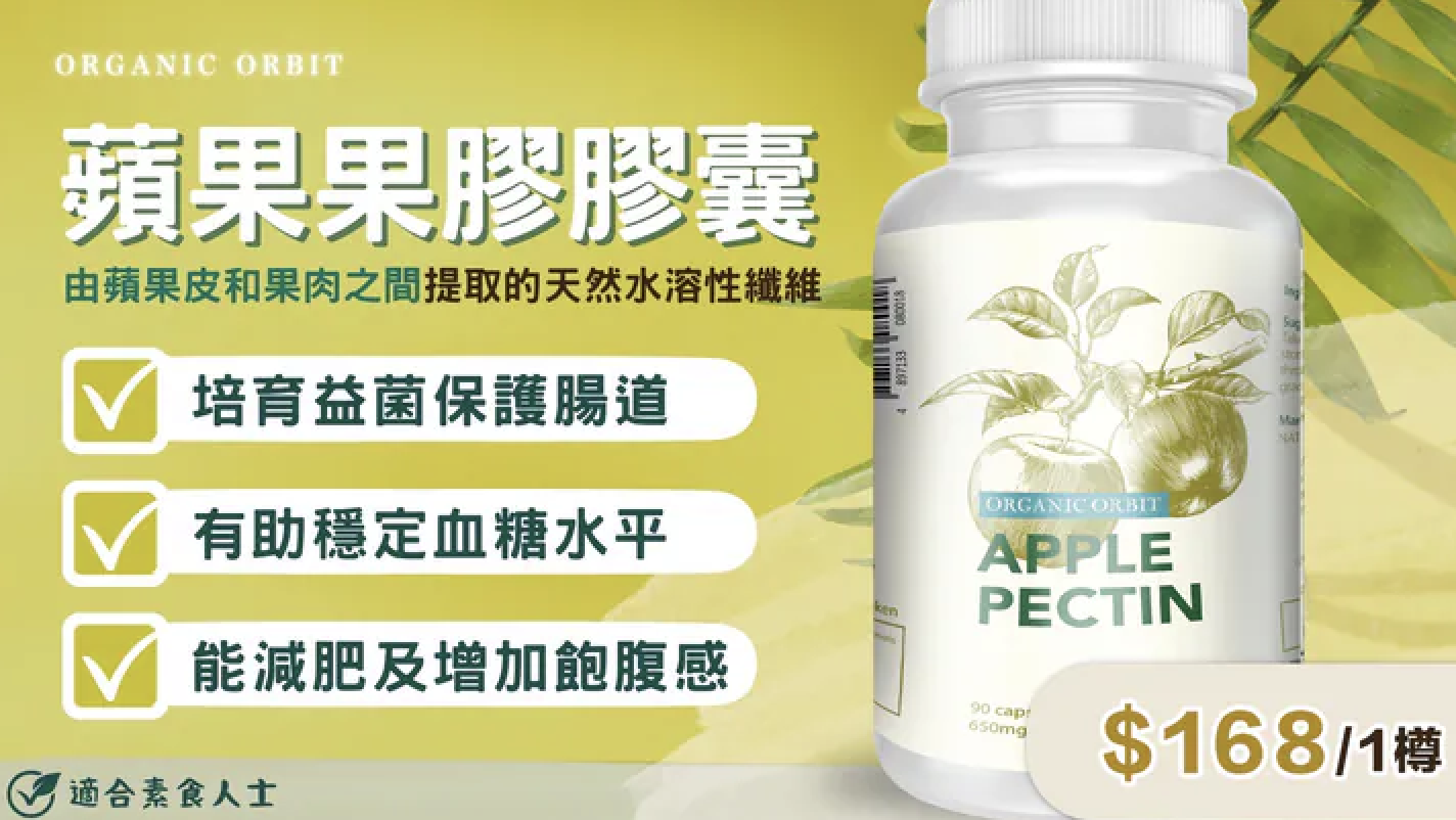 Organic Orbit 蘋果果膠膠囊 是由蘋果皮和果肉之間提取的天然水溶性纖維,當蘋果果膠與水混合時更具有凝膠形成作用,可以穩定血糖水平同維持腸道健康,同時更有減肥及增加飽腹感的作用。經常食用蘋果果膠,有助培育腸內益菌, 對敏感腸道有保護及舒緩的作用。