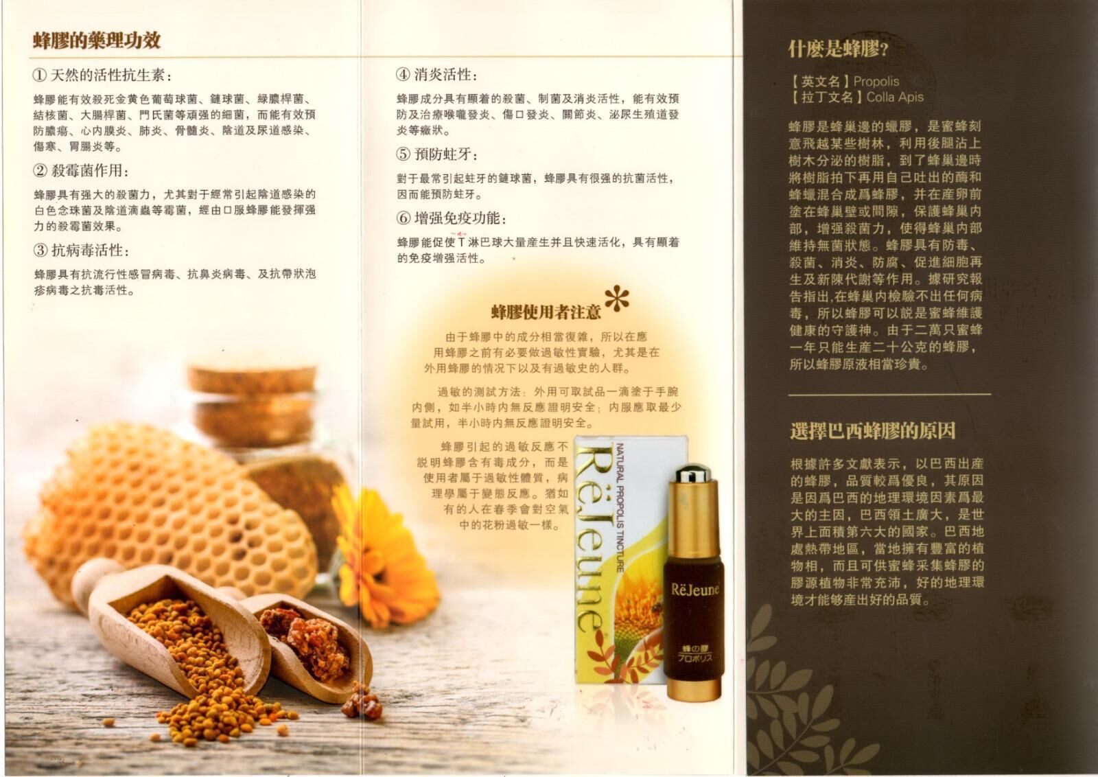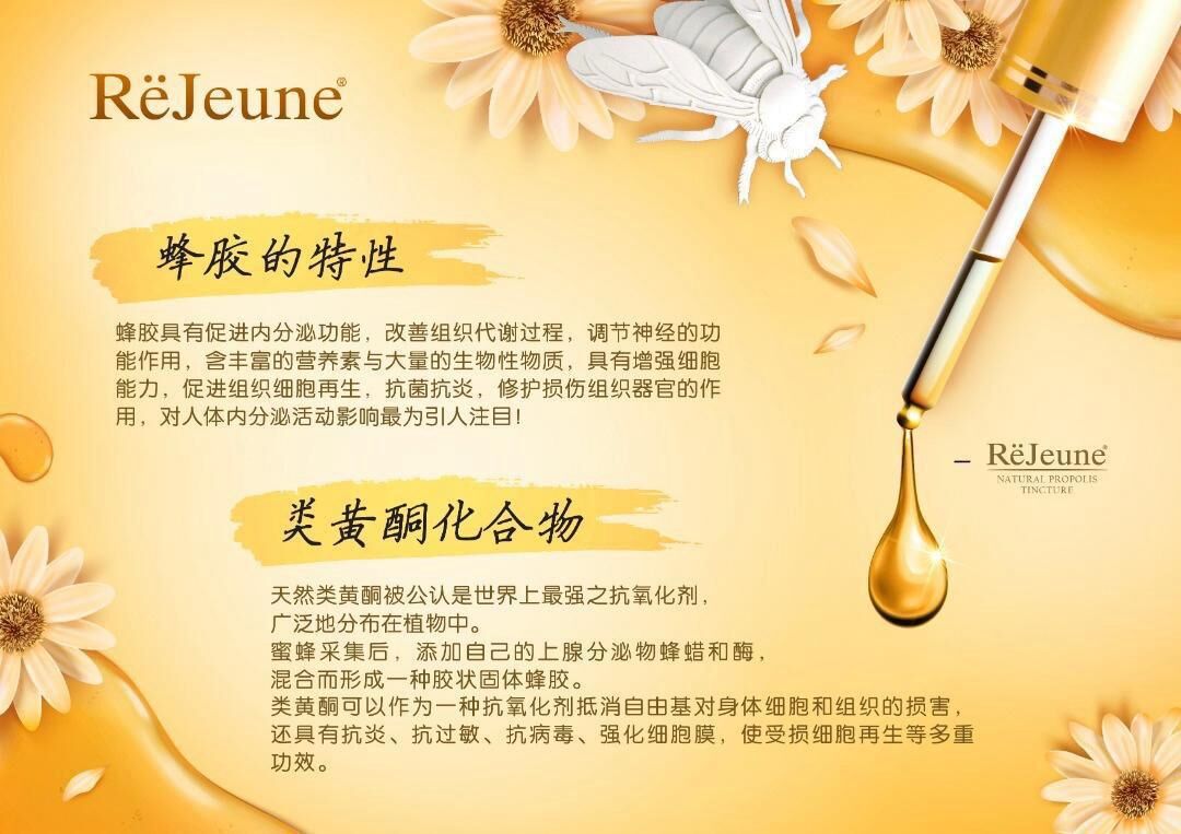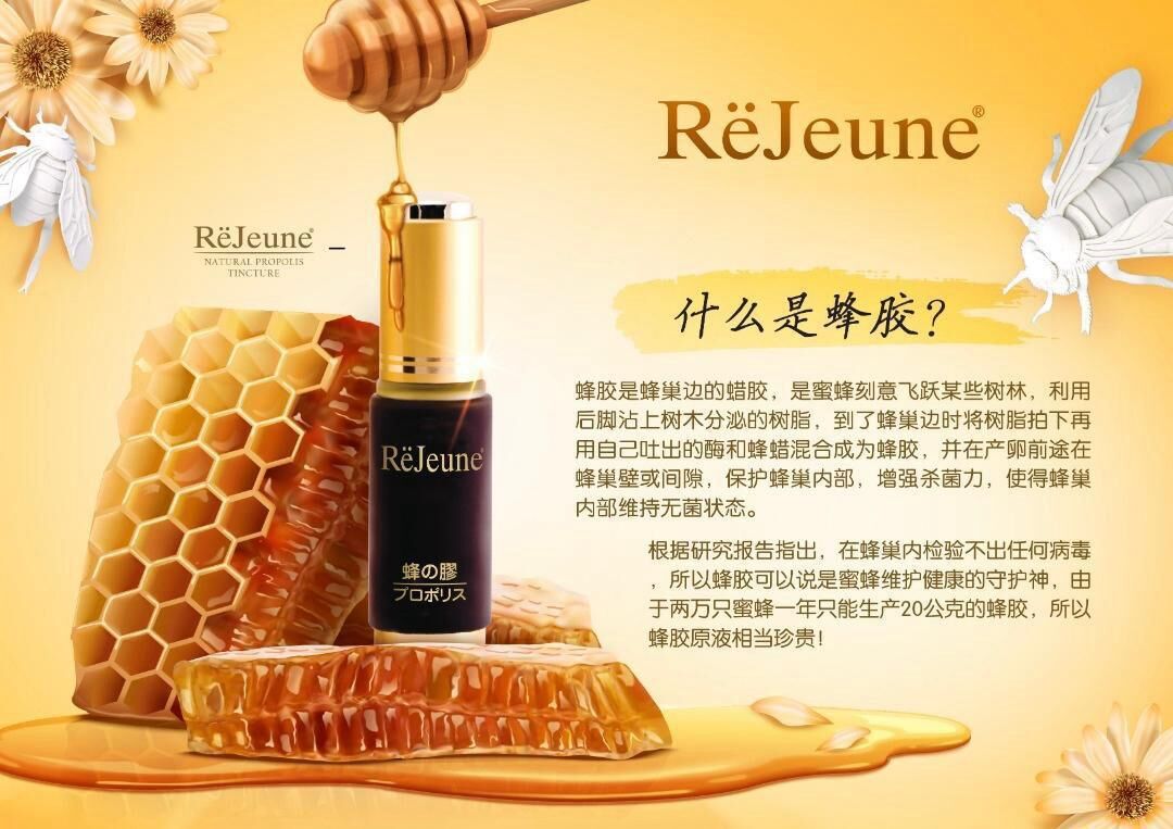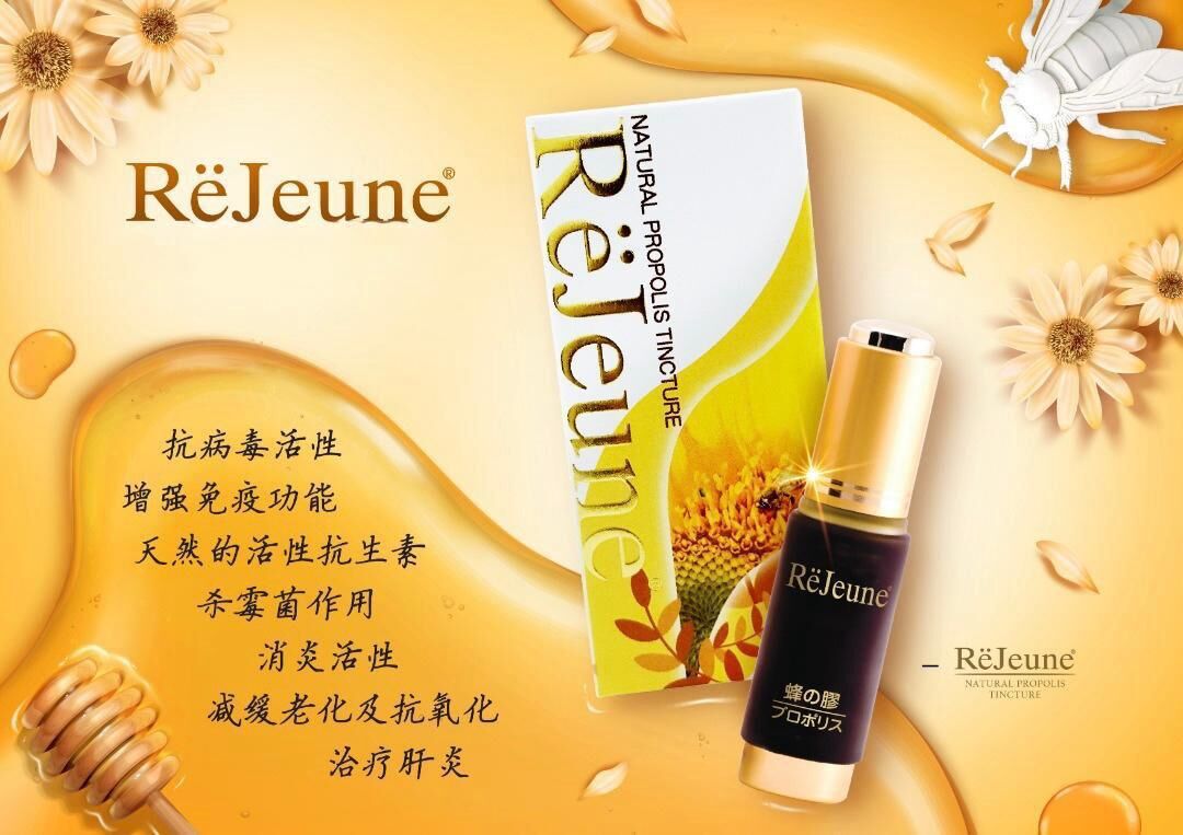 ReJeune Natural Propolis 天然蜂膠 -選用最優質產自巴西原始植物林的綠蜂膠,由於二萬只蜜蜂一年只能生產二十公克蜂膠,所以蜂膠原液相當珍貴。
