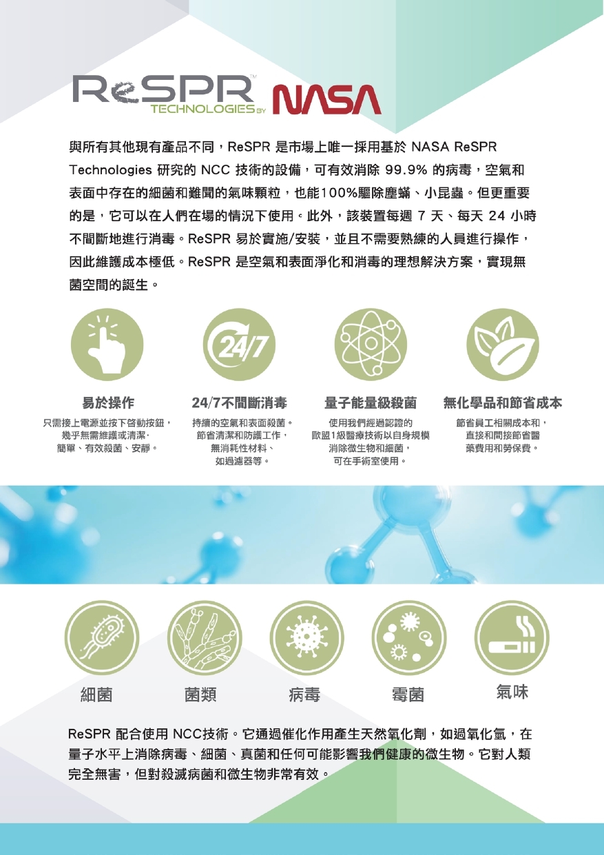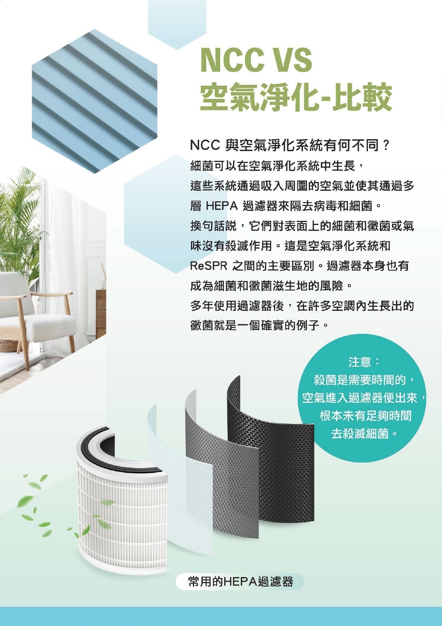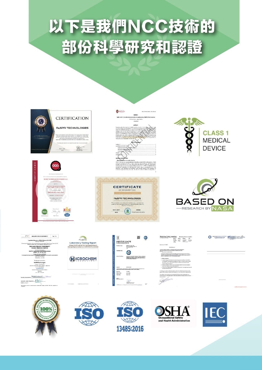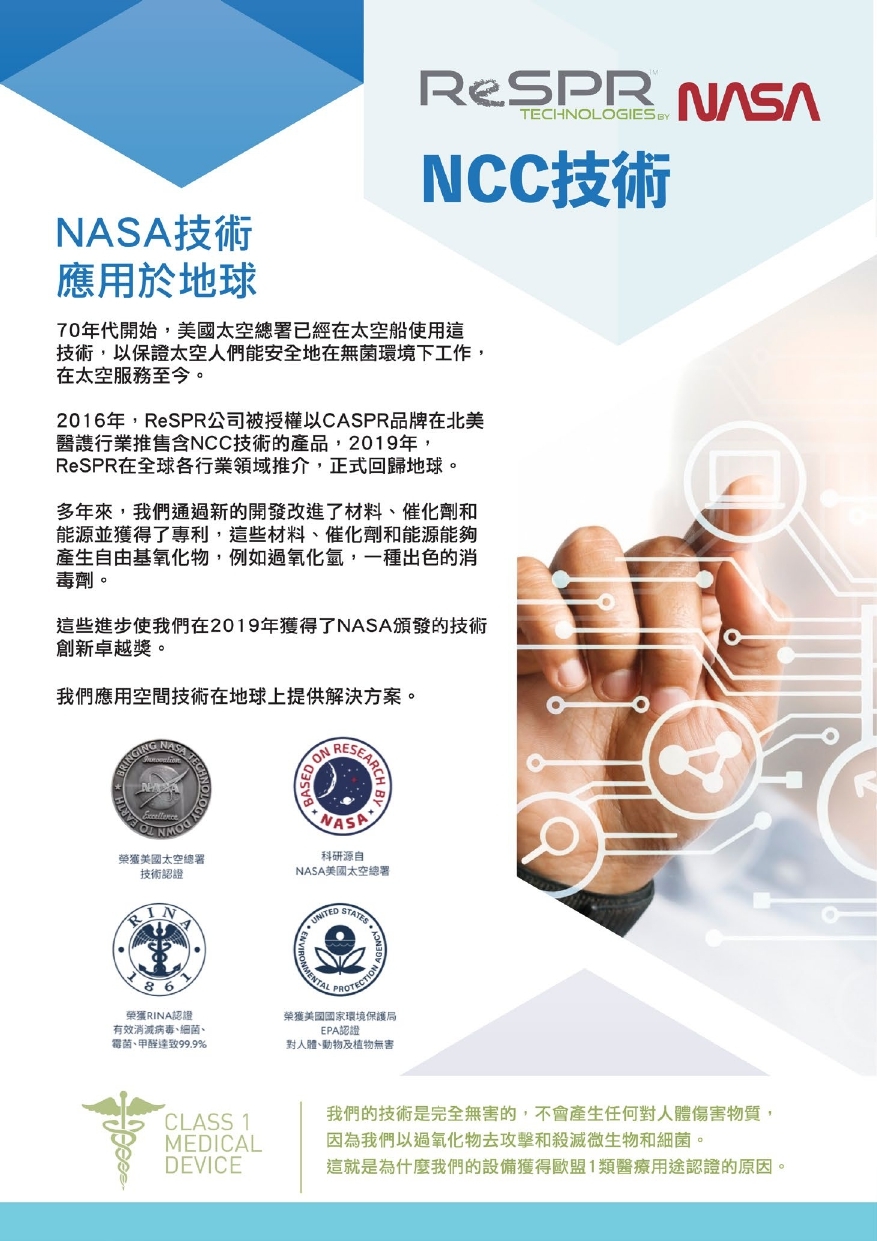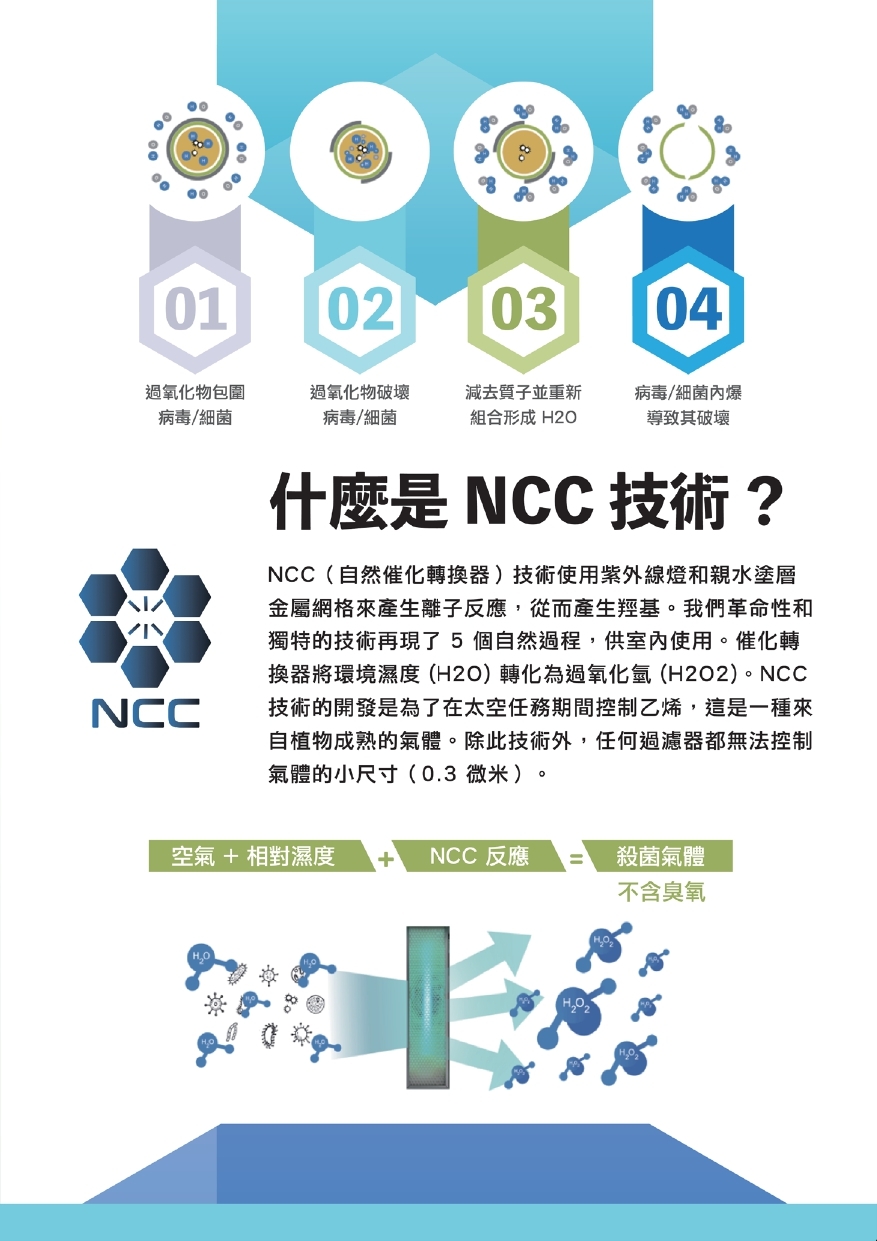 NCC技術是1962年美國首架登陸上月球的太空船內防止太空人受細菌感染的殺菌裝置的現在版。NCC能殺的包括細菌,病毒和真菌,包括COVID-19。