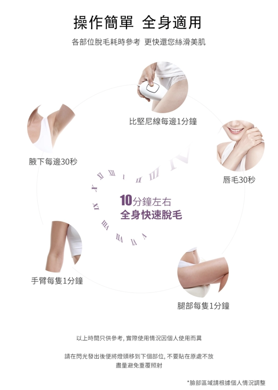 A: Silk’n Infinity宅光脫毛機的設計適合嘴唇或以下身體所有部位使用,最普遍的療程部位為: 嘴唇、面額、雙腿、腋下、手臂、比堅尼線。使用在嘴唇或面額時必須加倍小心,別讓強光照射眼部。使用煥膚燈盒在其他面部位置時,請閉上雙眼讓他人協助使用。