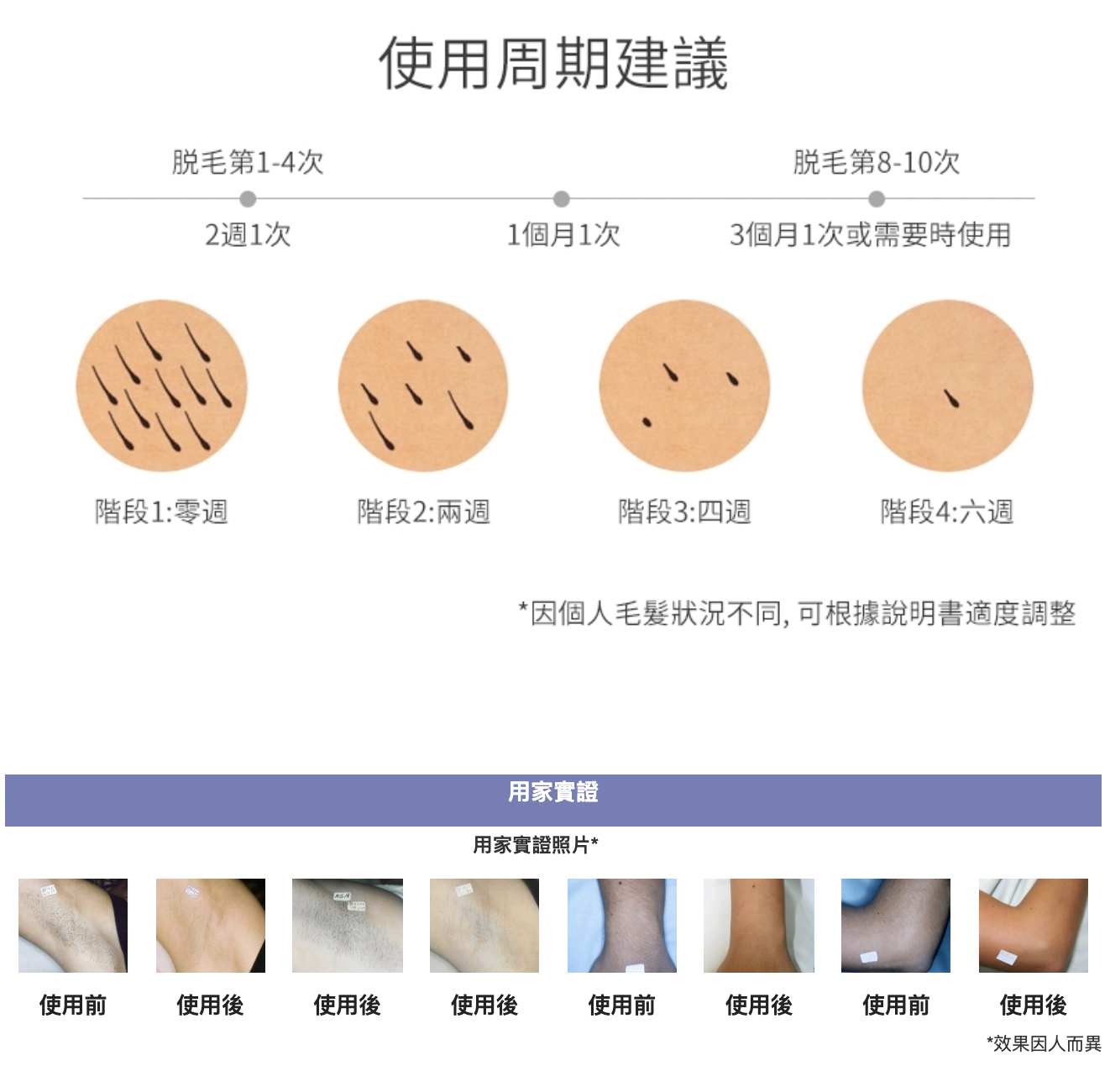 A: 照射後會在幾天-2周內陸續有毛毛脫落排出,但第一次也只是掉少部分,然後第2周後使用第二次,可以適當調高光波強度。這樣2年內定期使用15-20次就可以達到長效脫毛的效果的。