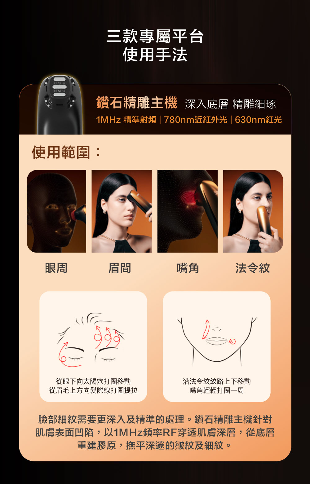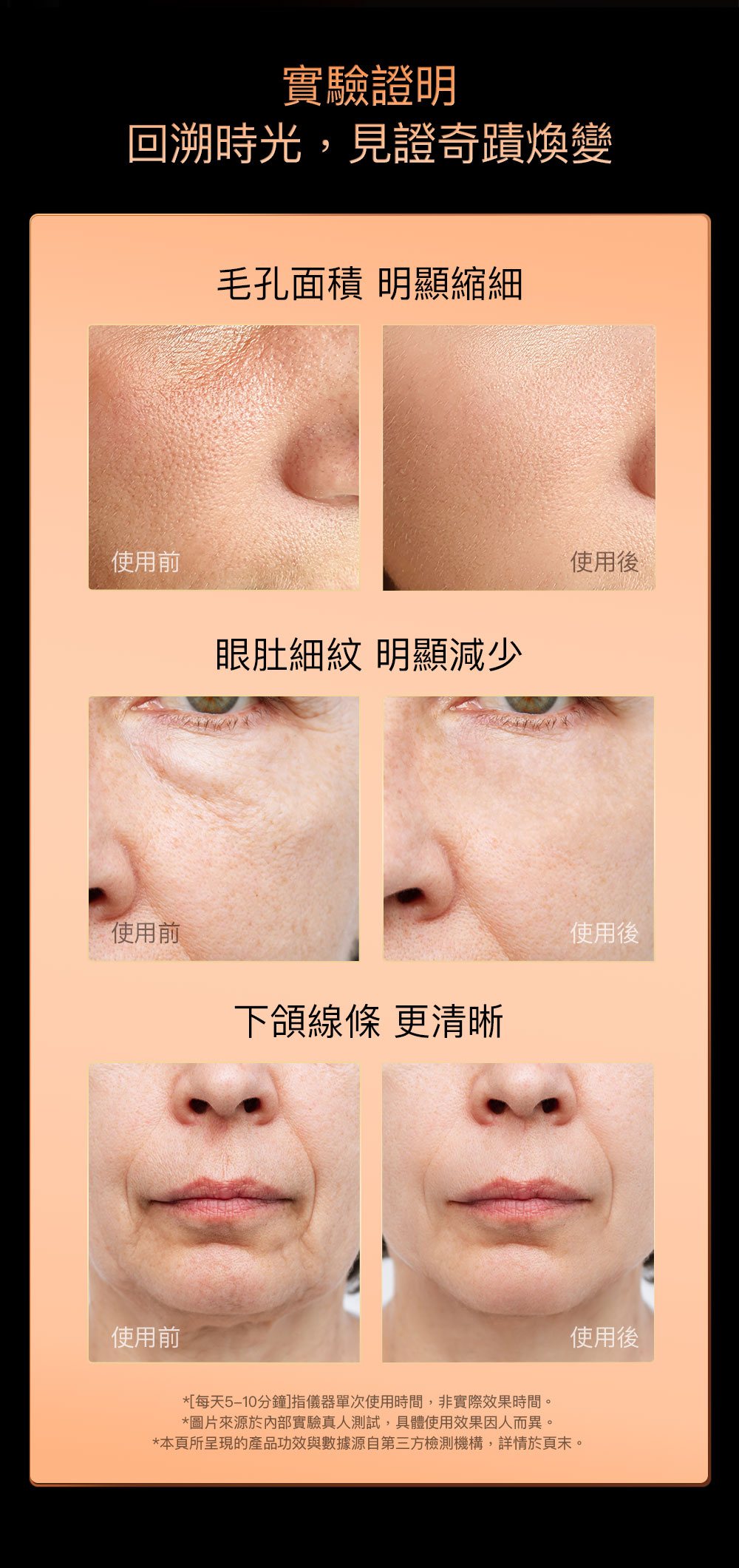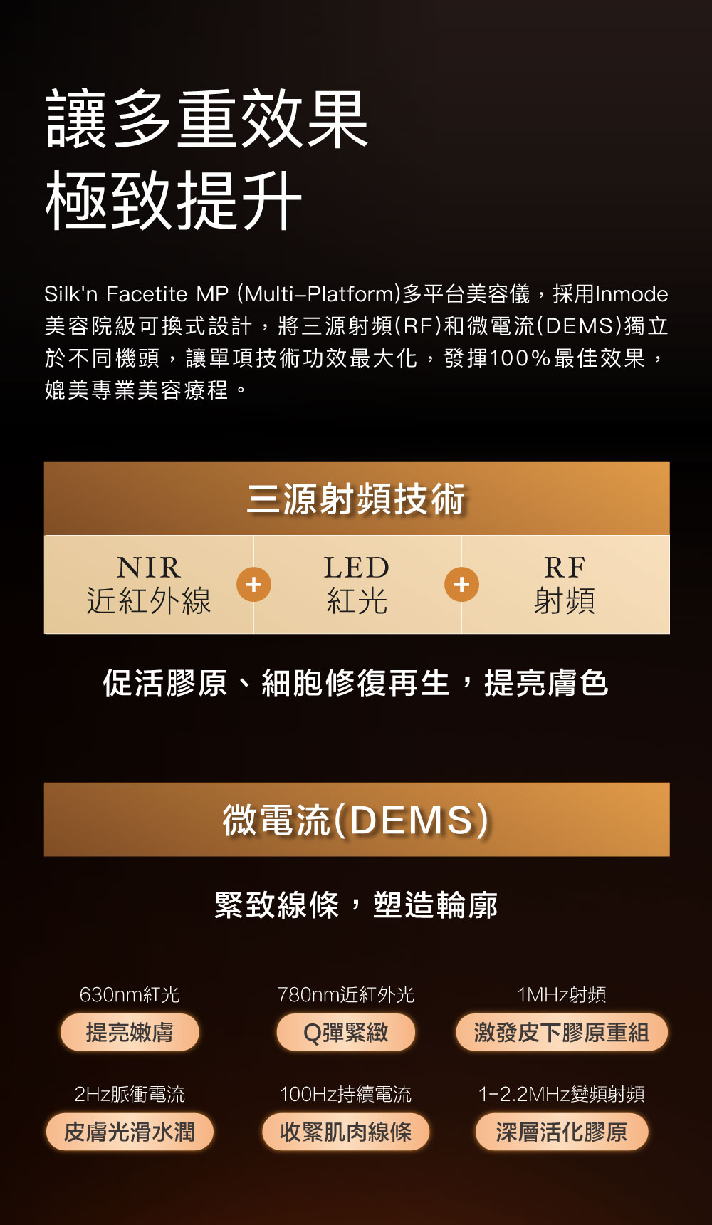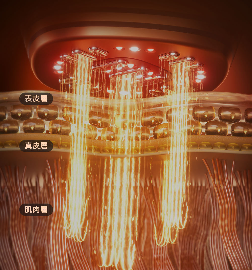 ❷ 三源射頻技術(NIR近紅外線+LED紅光+RF射頻)有助促活膠原、細胞修復再生,提亮膚色