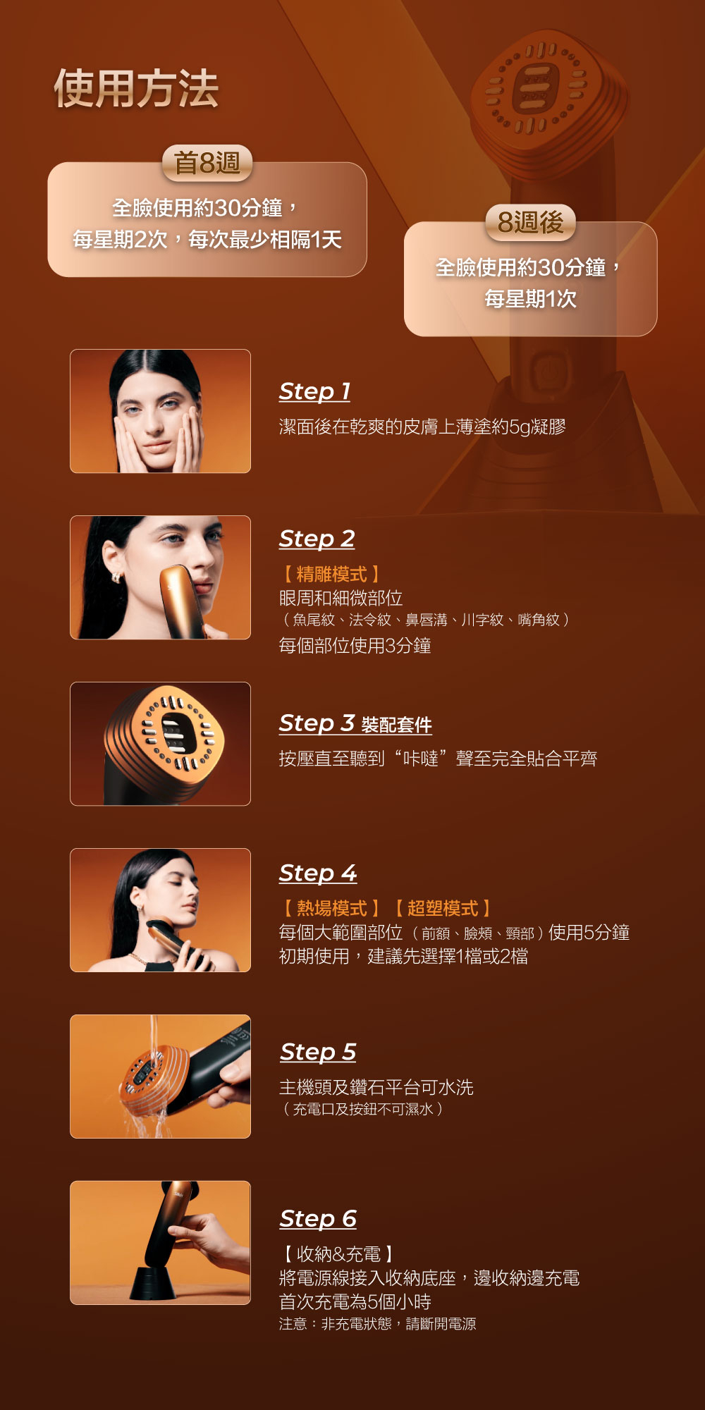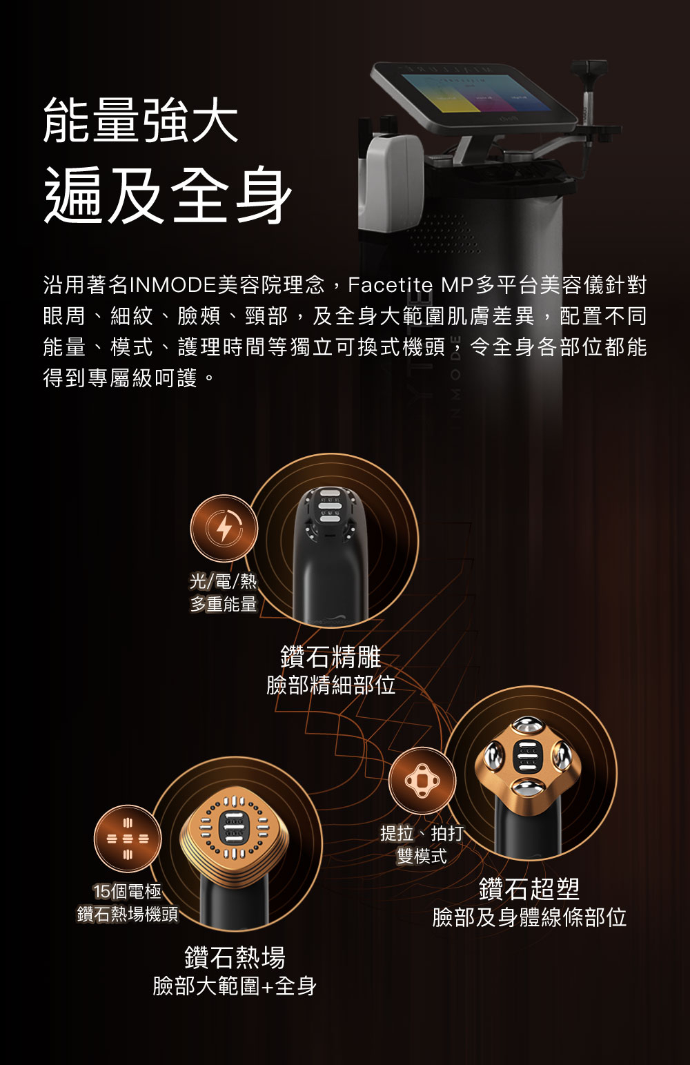 ❶ 可換式機頭針對全面及全身不同位置,可以改善雙下巴、面部線條及拜拜肉等等。
