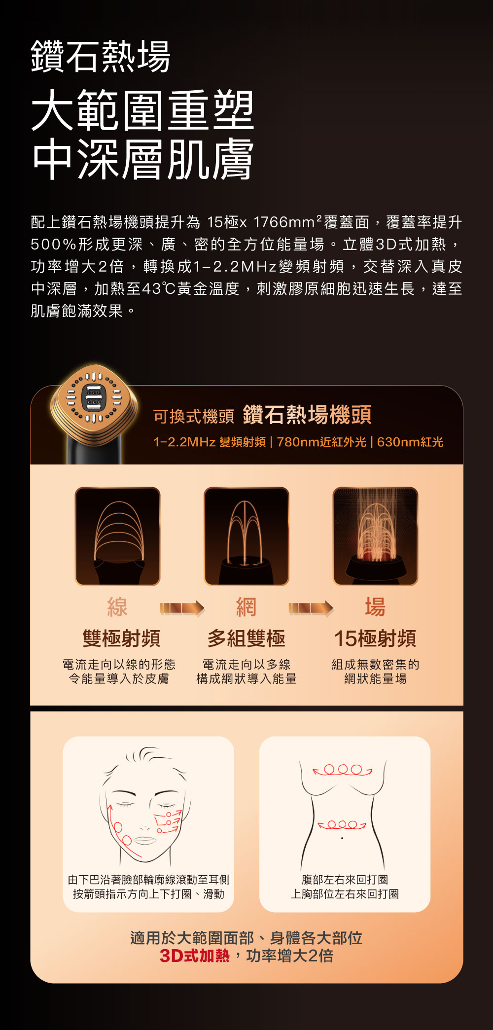 ❹ 15極大範圍射頻熱場,深入至肌底層,迅速持續升溫至43°c 黃金膠原沸點,激活膠原增生。
