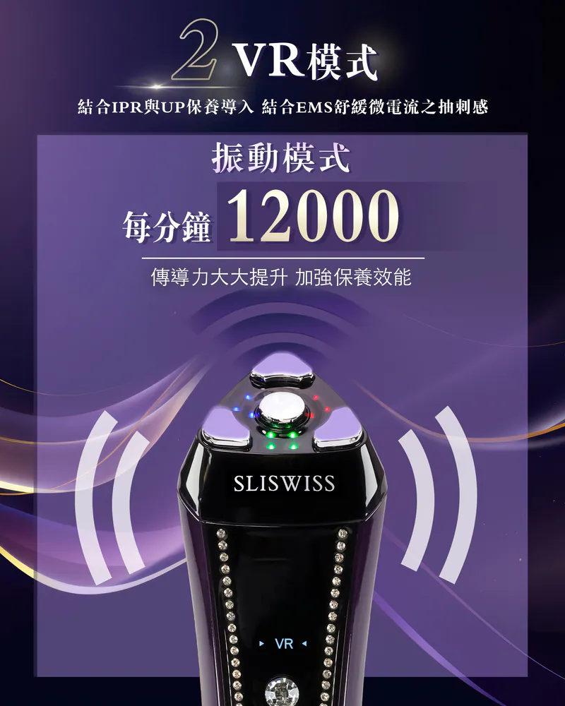 4. 【VR振動模式12000圈/分】:傳導力++雙效提升! 自由開啟震動輔助,結合IPR與UP保養導入效果更顯著;結合EMS可舒緩微電流之抽刺感