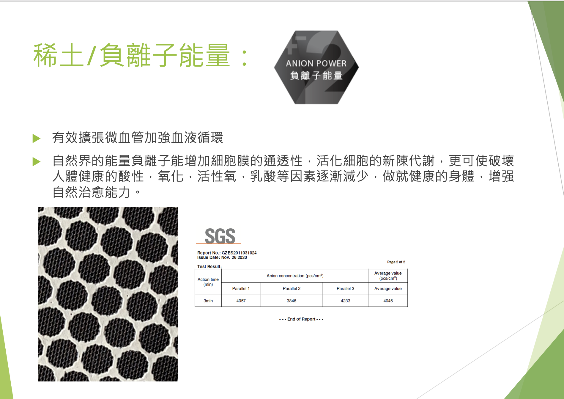 Fivepro 負離子護關墊具有稀土負離子能量層,是以17種的天然礦石元素包括黃土、鍺石、青蒙石、電氣石及翡翠等結合而成。在這些礦物均能釋放出負離子能量。