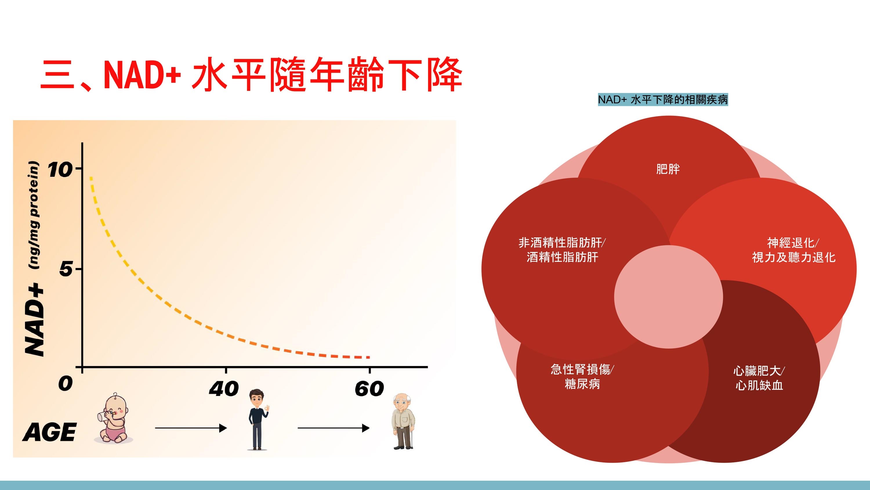 ● 許多研究表明,使用 NAD 前體,如煙酰胺單核苷酸 (NMN) 和煙酰胺核苷 (NR),可有效增加各種組織中的 NAD 水平並預防代謝疾病。