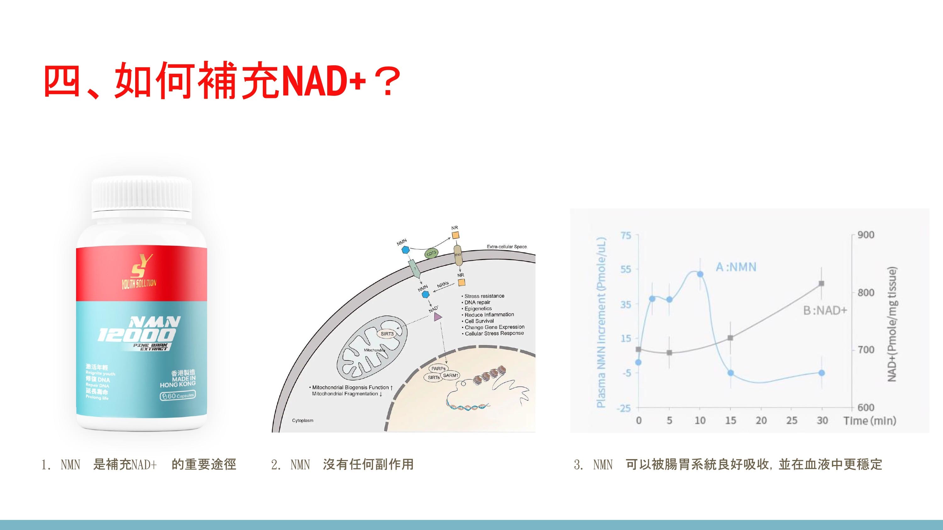 ● NMN 轉化為 NAD+,對細胞產生有益影響,包括線粒體功能、DNA 修復、基因表達、抗炎和細胞存活