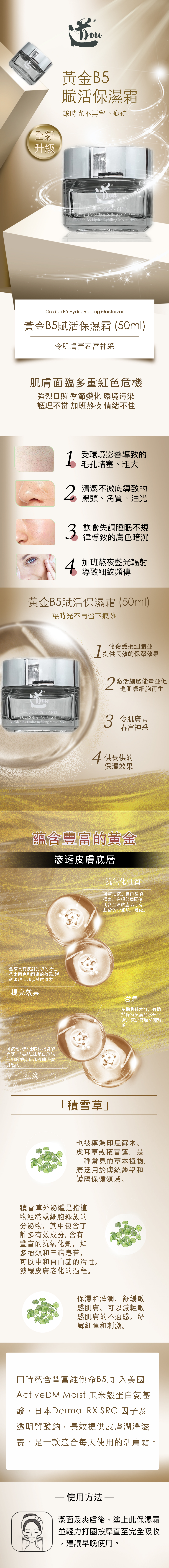 黃金B5賦活保濕霜 - 蘊含豐富的黃金、維他命B5和透明質酸鈉,可有效賦予肌膚新生活力,為肌膚細胞補充源源不絕的水份及營養。恆常使用,可令肌膚水潤嫩滑,同時散發出迷人的青春光采!