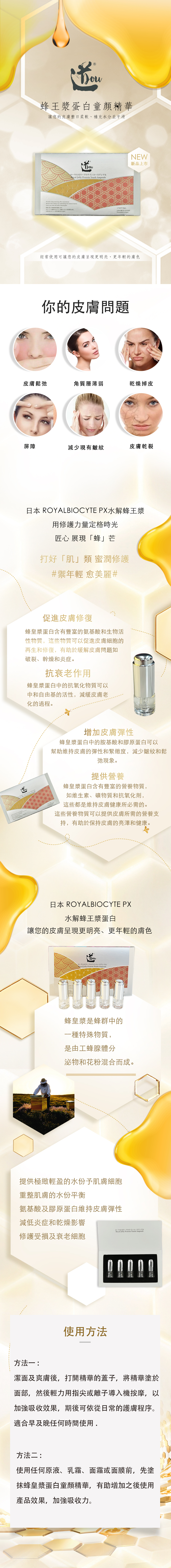 《道DOU》蜂王漿蛋白童顏精華,具有快速吸收和不黏膩的特點。加入了 法國 HyaSource®️ Care1000K、日本 ROYALBIOCYTE PX水解蜂王漿蛋白等強效成分,不停地加強您的皮膚保濕屏障,讓您的皮膚整日柔軟、補充水分並平滑。經常使用可讓您的皮膚呈現更明亮、更年輕的膚色。 德國Extrapone® Aloe Vera P 庫拉索蘆薈, 維持長效水潤,修復、鎮靜皮膚,幫助維持肌膚最佳狀態的元素。